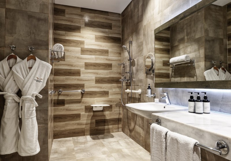 • Badezimmer Dusche oder Badewanne, Bademantel, Badeslipper, Haartrockner