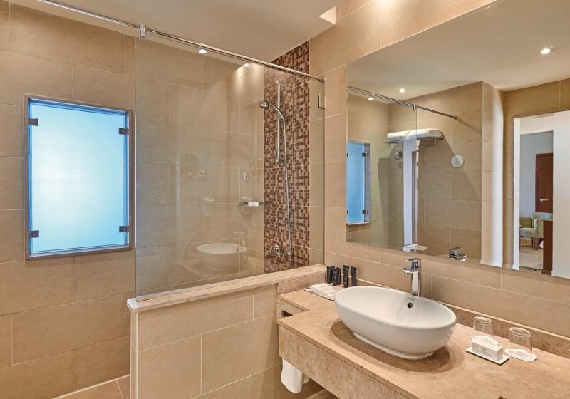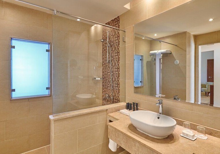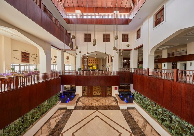 Die Infrastruktur ist großzügig: 718 Zimmer und Suiten, Lobby mit Rezeption und Lobbybar, Lounge und eine Shopzeile für Souvenirs. WLAN ist im gesamten Hotel kostenfrei verfügbar. Im Außenbereich dominieren mehrere Pools, ein weitläufiger Aquapark und der 400 Meter lange Lazy River, ergänzt durch ausreichend Liegen, Sonnenschirme und Badetücher an Pool und Strand.