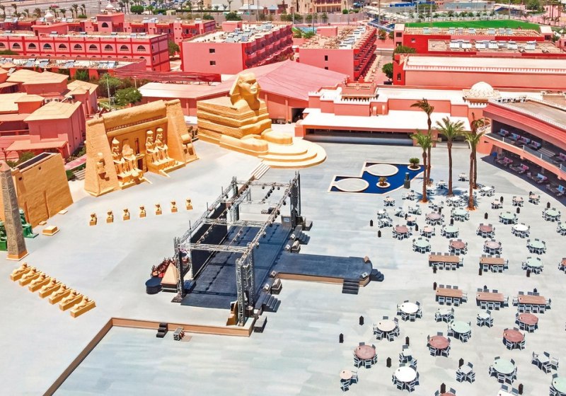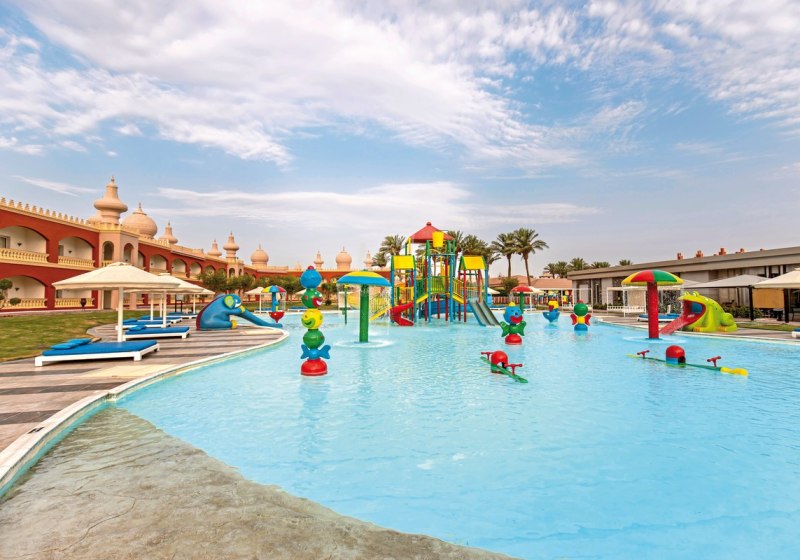 Das Pickalbatros Alf Leila Wa Leila Resort empfängt Euch als weitläufige Anlage im Stil eines orientalischen Dorfes. Zwischen Gassen, Plätzen und Wasserflächen bewegt Ihr Euch durch ein Resort, das mit sieben Pools, Sonnenterrassen und lebendigen Treffpunkten strukturiert ist. Die Atmosphäre wirkt unkompliziert, mit klaren Wegen zu Restaurants, Bars und Freizeitbereichen. Familien schätzen die Kinderpools mit Wasserrutschen, Aktivurlauber den Sportmix, Ruhesuchende die stilleren Ecken an den Becken und Terrassen.
