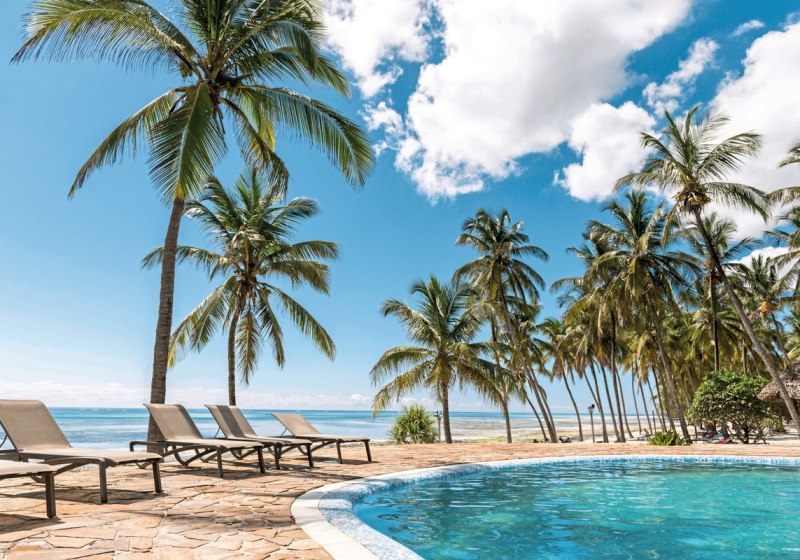 Im Karafuu Beach Resort & Spa wohnt Ihr direkt am Sandstrand der Ostküste Sansibars. Die weitläufige Anlage mit 166 Zimmern bietet Euch drei Pools, ruhige Gartenwege und offene Gemeinschaftsbereiche, in denen Ihr Euch schnell orientiert. WLAN im gesamten Hotel hält Euch überall verbunden. Das Ambiente wirkt entspannt, mit klarer Ausrichtung auf Strandtage, Wassersport und Zeit mit der Familie. Eltern schätzen den Kindergarten und das Kinderbecken, während Paare die Nähe zum Meer suchen. Highlight: Direkte Strandlage an der Ostküste mit großzügigen Außenbereichen.