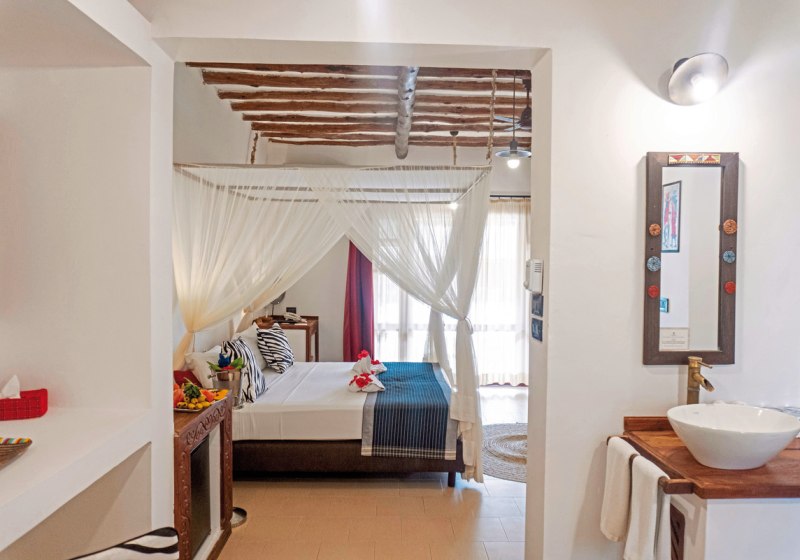Ihr wohnt an der Ostküste Sansibars, direkt am Strand. Die Distanz nach Stone Town und zum Flughafen beträgt jeweils etwa 65 Kilometer. So kombiniert Ihr ruhige Strandtage mit der Option auf Ausflüge in die Stadt. Die Lage eignet sich für morgendliche Spaziergänge am Wasser und kurze Wege zu allen Aktivitäten am Meer. Highlight: Direkte Strandlage mit klarem Fokus auf Bade- und Meereserlebnisse.