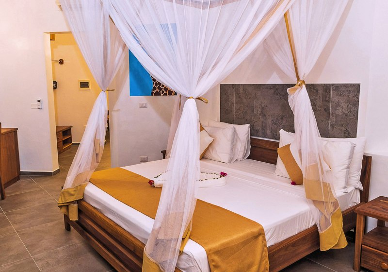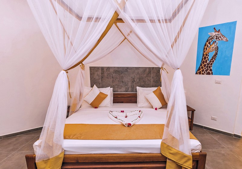 Ihr wohnt an der Nordostküste Sansibars, in Pwani Mchangani, direkt an der Strandpromenade. Der Sand beginnt hinter der Sonnenterrasse, die Wege sind kurz und intuitiv. Das Meer prägt den Tagesablauf, die Promenade bringt Bewegung und Abwechslung. Orientierung gelingt leicht, ob Ihr zum Strand, zur Bar oder zurück ins Zimmer möchtet.