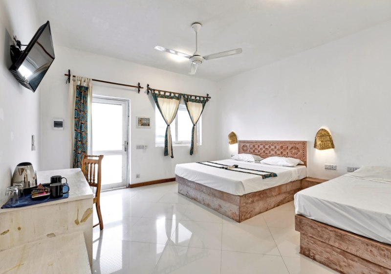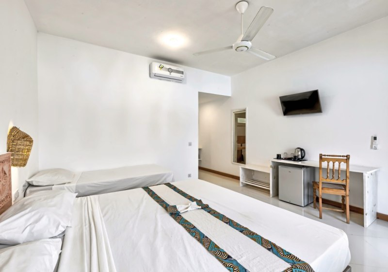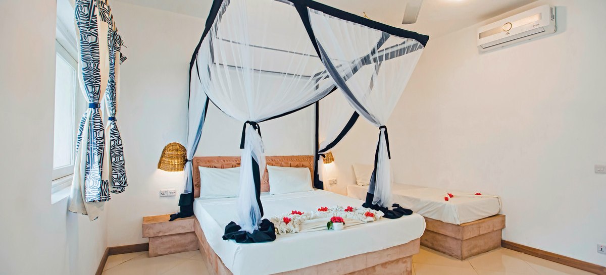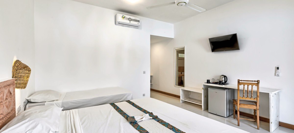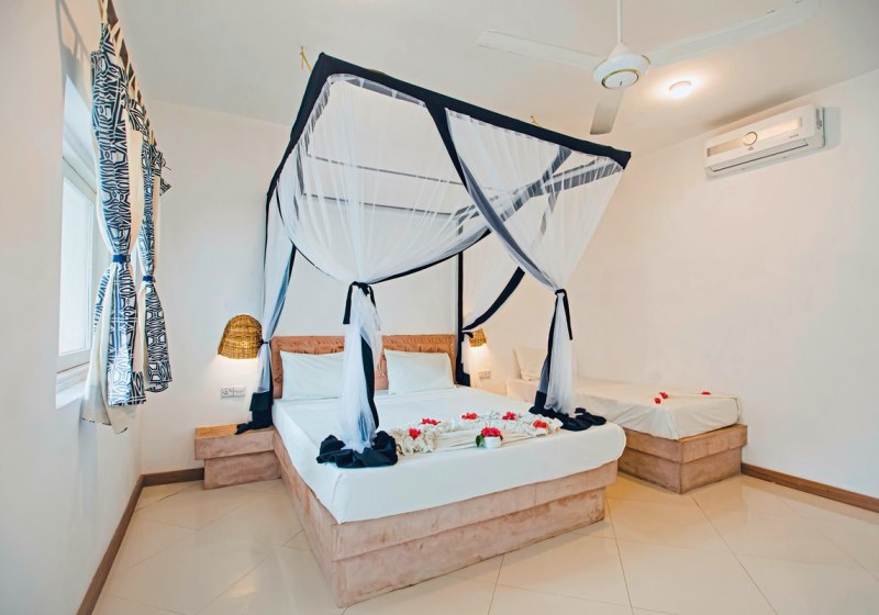 Ihr wohnt in Zimmern mit eigenem Bad, Klimaanlage und Ventilator. Moskitonetz, Safe, Föhn, Minibar und TV gehören zur Grundausstattung. WLAN ist in der Anlage kostenfrei verfügbar. Viele Zimmer öffnen sich zu einem Balkon oder einer Terrasse; wahlweise blickt Ihr in den Garten, auf den Pool oder seitlich zum Meer. Highlight: Klare Ausstattung mit Klimaanlage, Moskitonetz und Außenbereich.