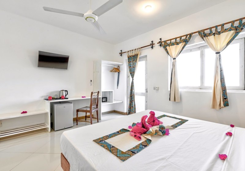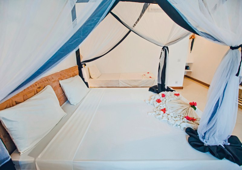 - Durchdachte Basics: AC, Ventilator, Moskitonetz und Safe sorgen für Ruhe.