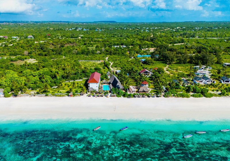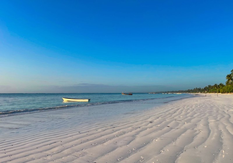 Ihr wohnt in Matemwe an der Nordostküste Sansibars, direkt am Sandstrand. Der Weg zum Wasser ist kurz und ohne Umwege, die Atmosphäre maritim und geradlinig. Stone Town liegt etwa 50 Kilometer entfernt, ebenso der internationale Flughafen. Damit verbindet Ihr Strandtage mit Ausflügen, die planbar, aber nicht städtisch geprägt sind. Die Umgebung wirkt ruhig, mit Fokus auf Meer und Strand.