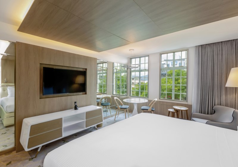 In den Zimmern erwartet Euch eine klare Ausstattung: Klimaanlage, Safe, TV und WLAN, dazu Dusche, WC und Haartrockner. Praktische Details wie Schreibtisch, Bügeleisen/-brett, Kühlschrank sowie Kaffee-/Teezubereiter erleichtern den Alltag. Bademantel und Hausschuhe stehen bereit, die Schallisolation fördert konzentriertes Arbeiten und ruhige Nächte.