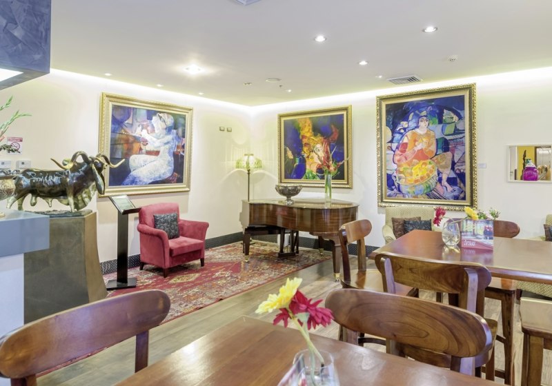 Ihr bewegt Euch in kompakten Wegen zwischen Rezeption, Café, Restaurant und Dach- beziehungsweise Sonnenterrassen. Der Außenpool mit Liegestühlen und Sonnenschirmen bietet einen ruhigen Pol, während Bibliothek, TV-Raum und Garten diskrete Rückzugsorte eröffnen. Mehrsprachiger Service, WLAN in der gesamten Anlage und durchdachte Services – vom hoteleigenen Shuttleservice bis zur SB-Wäscherei – sorgen dafür, dass Ihr Euch auf Inhalte statt Organisation konzentriert. Highlight: Fünf-Sterne-Landeskategorie und Boutique-Format schaffen einen klar strukturierten, effizienten Aufenthalt.