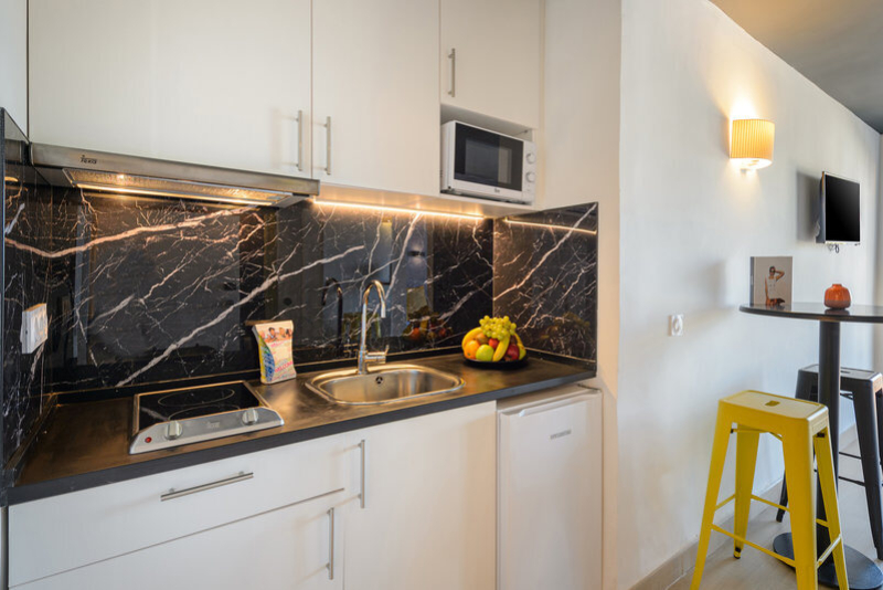 Die Zimmer sind mit Klimaanlage, Balkon, Badezimmer mit Badewanne und separatem Schlafzimmer ausgestattet. Zudem verfügen sie über einen Kühlschrank, Haartrockner und Internetzugang. Weiterhin gibt es eine Kochnische mit Minikühlschrank und Minibar sowie Telefon, Safe und TV.