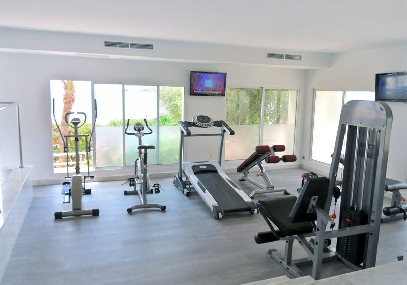 Wenn Ihr Bewegung sucht, startet Ihr direkt im hauseigenen Fitnessraum. Für lockere Bahnen und Aquasessions bietet sich der Außenpool an, flankiert von der Sonnenterrasse am Meer. Die Lage motiviert außerdem zu Spaziergängen entlang der Bucht in Richtung Ibiza-Stadt – ideal, um Aktivität und Stadterlebnis zu verbinden.