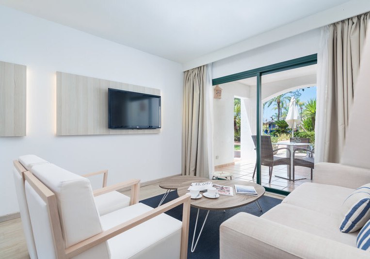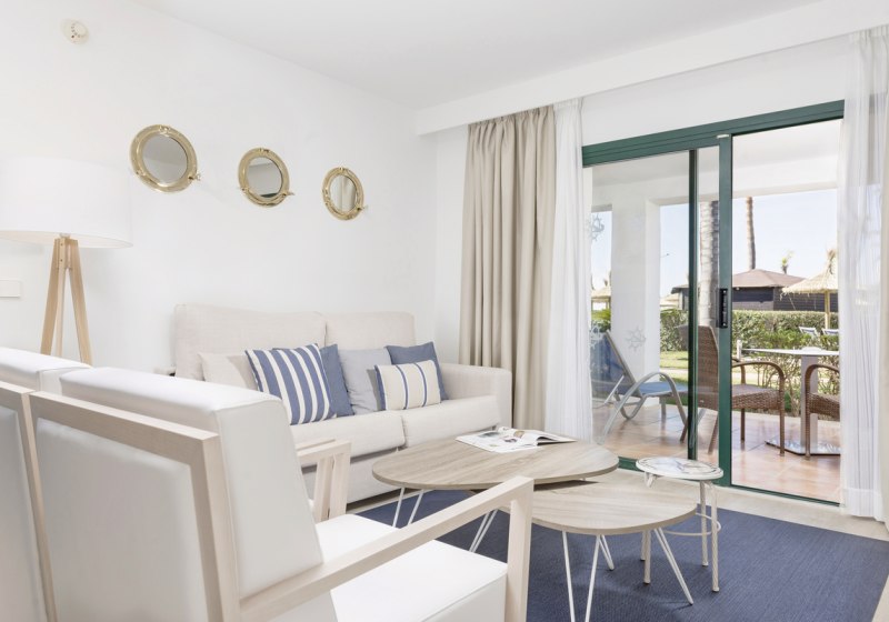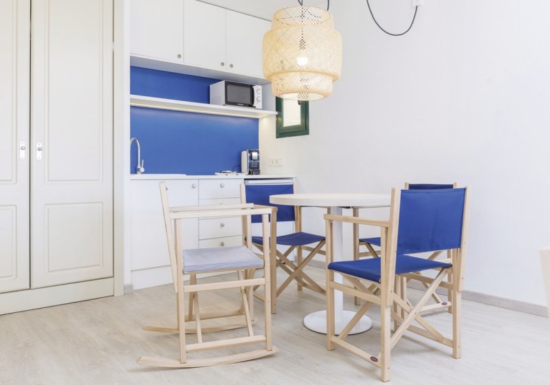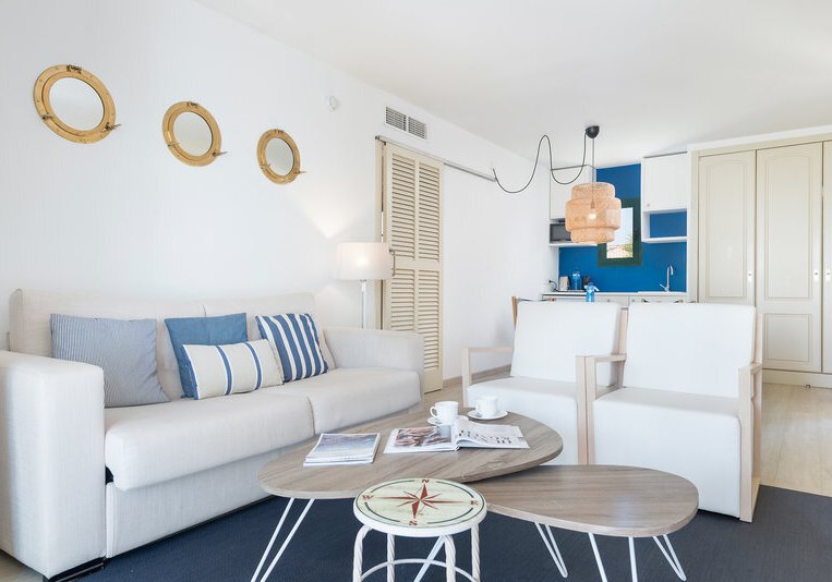 Die Suiten erweitern den Raumkomfort mit Wohnzimmer und Kitchenette inklusive Mikrowelle. Im Bad warten Massagedusche sowie Badewanne mit Hydromassage. Je nach Lage seht Ihr das Meer seitlich oder direkt. Wer gerne frühstückt, nutzt die Kitchenette für einen ruhigen Start. Highlight: Suiten mit Hydromassage und wahlweise Meerblick.