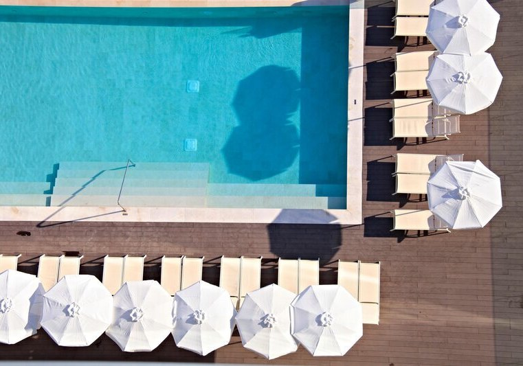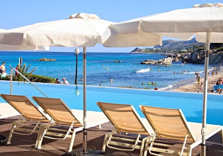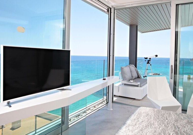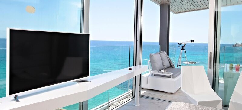 Die Infrastruktur ist klar und modern: Lobby mit Rezeption, zwei Aufzüge, durchgängiges WLAN und eine Sonnenterrasse mit Liegen und Schirmen. Am Außenbereich liegt der Infinity-Pool mit präzisem Blick auf das Meer; Badetücher sind inklusive.