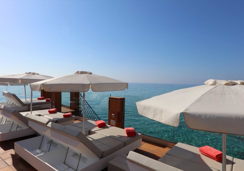 • Aussicht genießen: Terrassen und Beach Club rahmen den Abend am Meer.