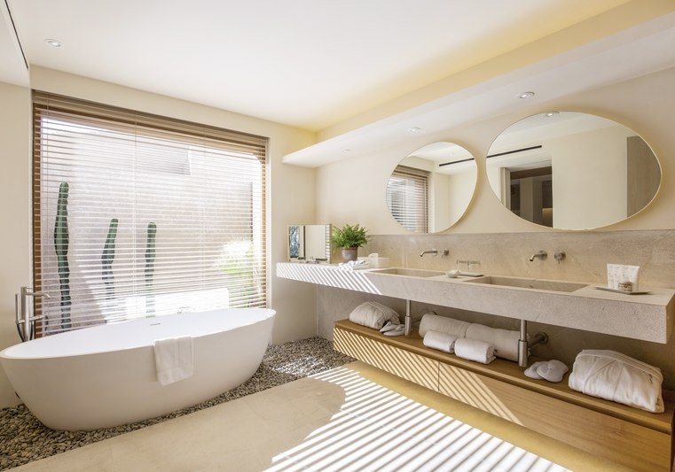 Alle 30 Einheiten sind Suiten mit Terrasse und bodentiefen Fenstern. Markant ist das großzügige Bad mit Regendusche, freistehender Badewanne und zusätzlicher Außendusche. Für Technik und Komfort sorgen Bang & Olufsen LCD-Sat-TV, Telefon, WLAN, Safe, Minibar, Klimaanlage und Kaffeemaschine. Highlight: Suiten-Only – jedes Zimmer mit Terrasse und großzügigem Badkonzept.