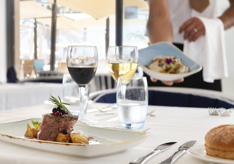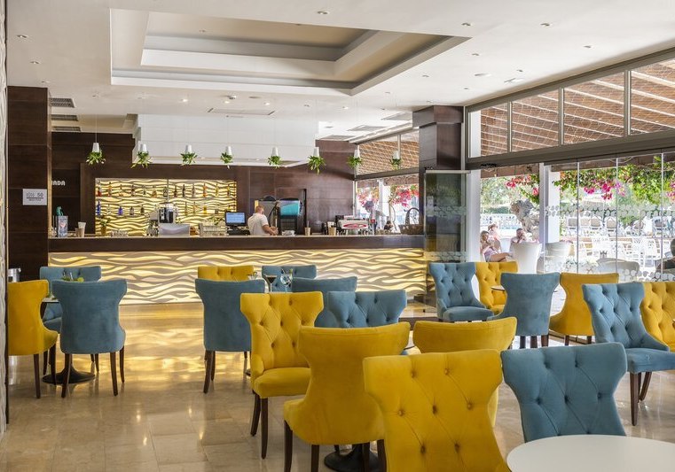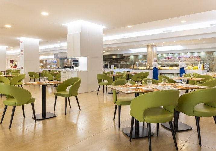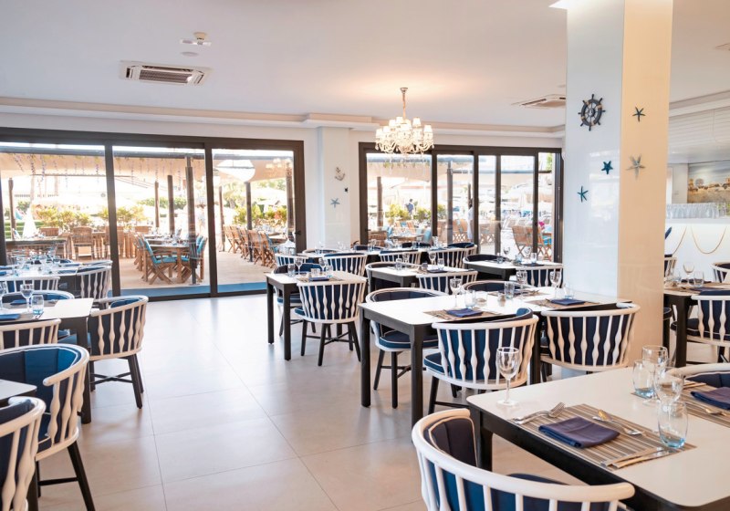 Kulinarisch wählt Ihr zwischen dem Buffetrestaurant Irina mit Außenterrasse, dem Buffetrestaurant Don Jaime mit Terrasse direkt am Strand, der Bar Nikita und der Snackbar Burger Corner. Das Angebot umfasst vegane und vegetarische Optionen, dazu Kindermenüs und Diätgerichte; Live-Kochen setzt frische Akzente am Buffet.