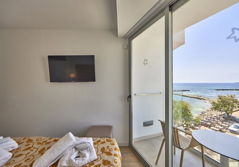 82 Zimmer bilden den Rahmen – mit Telefon, Sat-TV, WLAN, Minikühlschrank, Föhn sowie Balkon oder Terrasse. Dusche oder Bad/WC sind standardmäßig vorhanden; der Safe ist teils gebührenpflichtig. Wer vorne am Wasser wohnen will, wählt Superior Seafront und erhält zusätzlich Bademäntel, Slipper und einen kostenfreien Safe.