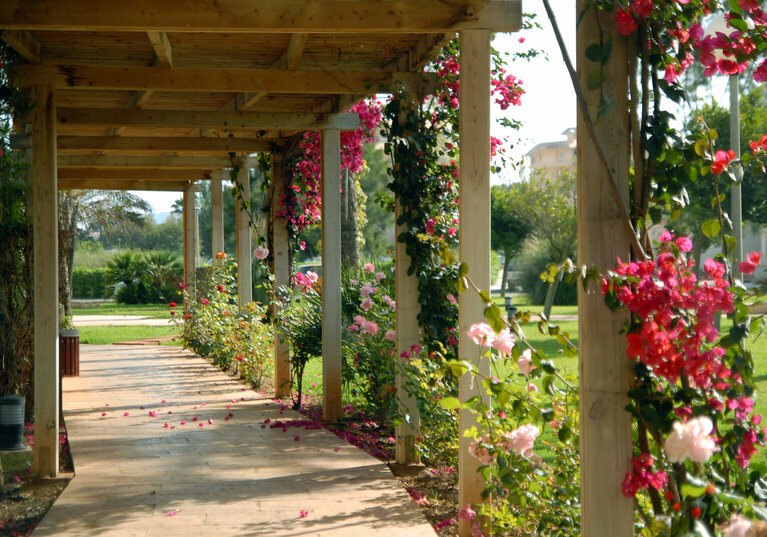 - Sonnenterrasse: Liegen und Schirme warten in der weitläufigen Gartenanlage.
