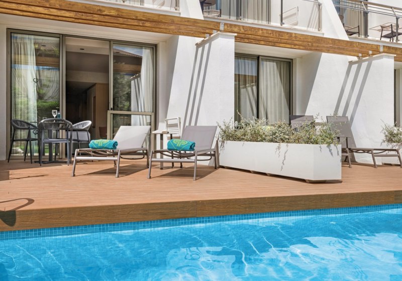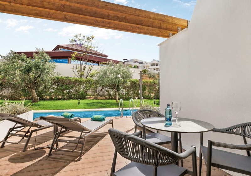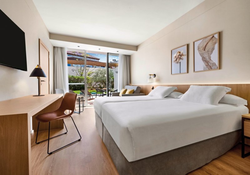 Ihr wählt zwischen Doppelzimmern, Superior, Select und Suiten – alle mit Dusche, WC, Föhn, Klimaanlage, TV, Minibar, Mietsafe, Telefon und Balkon oder Terrasse. Die Doppelzimmer messen etwa 22 Quadratmeter. Superior liegen im Erdgeschoss mit großer Terrasse, was die Wege zum Garten kurz macht.