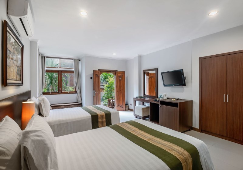 Im Adi Dharma Hotel Legian wohnt Ihr in einer ruhigen Seitengasse von Legian, nah genug am Geschehen und dennoch angenehm abgeschirmt. Das Haus ist kompakt, mit 37 Zimmern über drei Etagen, und wirkt dadurch persönlich und überschaubar. Ein grüner Gartenrahmen, der Außenpool mit separatem Kinderbecken und eine sonnige Terrasse prägen die entspannte Tagesstimmung. WLAN nutzt Ihr in der gesamten Anlage kostenfrei, so bleibt Ihr auch im Urlaub flexibel.