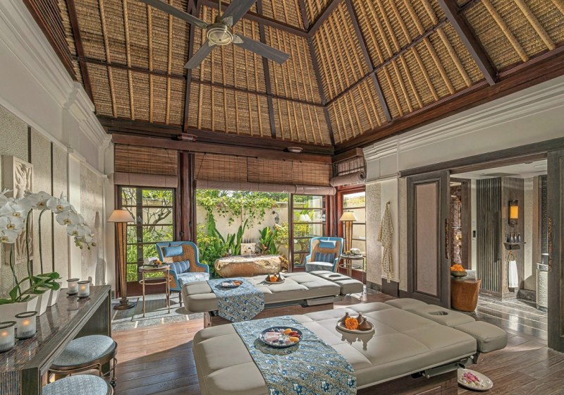 Das Healing Village Spa misst circa 2.000 Quadratmeter und bündelt klar definierte Anwendungen. Neben balinesischen Therapien kommen Licht-, Ton-, Wärme- und Farbtherapien zum Einsatz. Massagen und Algenbehandlungen sind fest verankert; Maniküre, Pediküre und ein hauseigener Friseur ergänzen das Programm.
