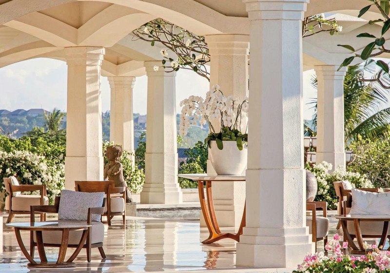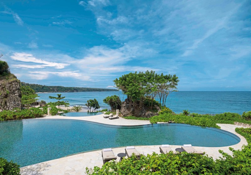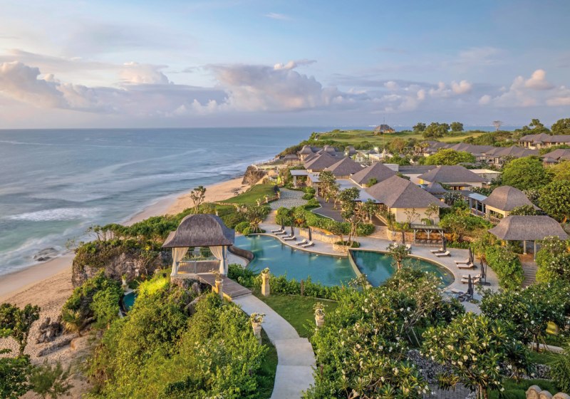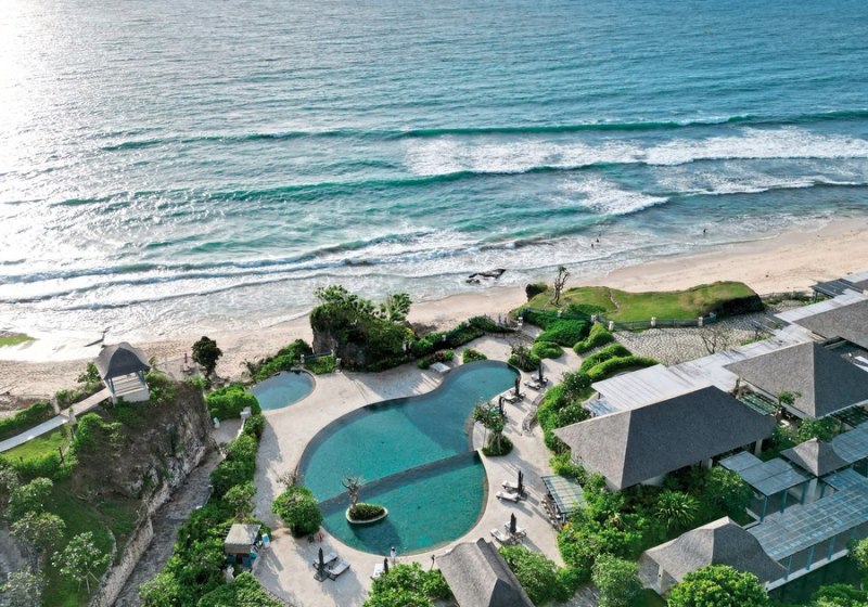 Jumeirah Bali empfängt Euch auf einem Kalksteinfelsen an Balis Südwestspitze – ein Refugium mit klarer Formsprache, viel Raum und spürbarer Ruhe. Ihr wohnt in eigenständigen Villen, jede mit privatem Pool, großer Terrasse und eigener Außendusche. Der Blick reicht über Gärten und, je nach Kategorie, über den Ozean bis hin zum Surferstrand Dreamland. Die Atmosphäre wirkt gepflegt und gelassen; Wege führen durch die Gartenanlage hinunter zum privaten Strandzugang. Zwischen Adults-only-Pool und Lounge-Bereichen findet Ihr geschützte Ecken für lange Nachmittage in der Sonne.
