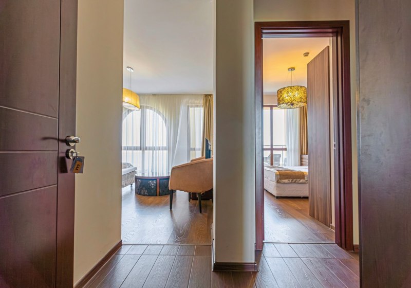 Das Golden Line liegt am Goldstrand in Bulgarien, rund 200 Meter vom Strand und etwa 300 Meter vom Zentrum entfernt. Nach Varna sind es circa 18 Kilometer, zum Flughafen rund 25 Kilometer. Ihr wechselt so leicht zwischen Strandtag, Bummel durch Geschäfte und Ausflügen in die Stadt – alles gut erreichbar.