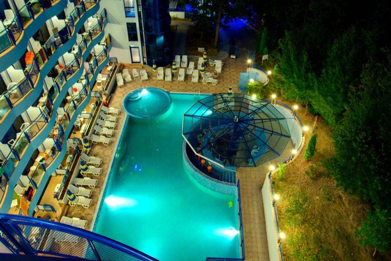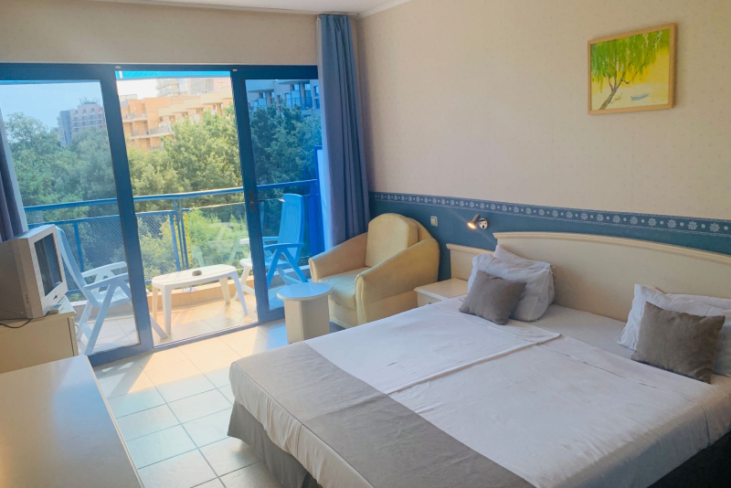 Im Herzen vom Goldstrand, etwa 100 Meter vom Strand entfernt und mitten in der beliebten Partymeile des Ferienortes, befindet sich das Hotel Aphrodite. Einkaufsmöglichkeiten, Restaurants, Bars und Diskotheken liegen in unmittelbarer Nähe des Hotels. Auch zum beliebten Erlebnisbad Aquapolis, zum Naturpark Slatni Pjassazi und zum Yachthafen sind es nur wenige Minuten zu Fuß. Es gibt eine Busverbindung, die in der gesamten Region Varna verkehrt.