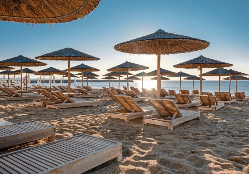 - Strandkomfort: Liegen und Schirme stehen am Strand wie am Pool bereit.