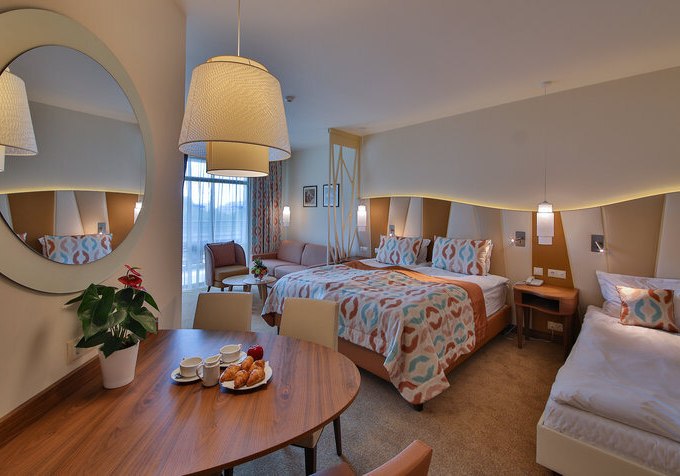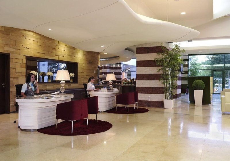 Im Flamingo Grand Hotel & Spa wohnt Ihr in einem stilvollen Haus im Zentrum von Albena, nur 150 Meter vom Strand entfernt. Die großzügigen öffentlichen Bereiche mit Empfangshalle und Poollandschaft wirken klar strukturiert und angenehm ruhig. Familien, Geschäftsreisende sowie Seminar- und Tagungsgäste finden verlässliche Infrastruktur und einen aufmerksamen, professionellen Rahmen. Highlight: Ruhige Lage nahe Strand und Zentrum mit klarer, moderner Linie.