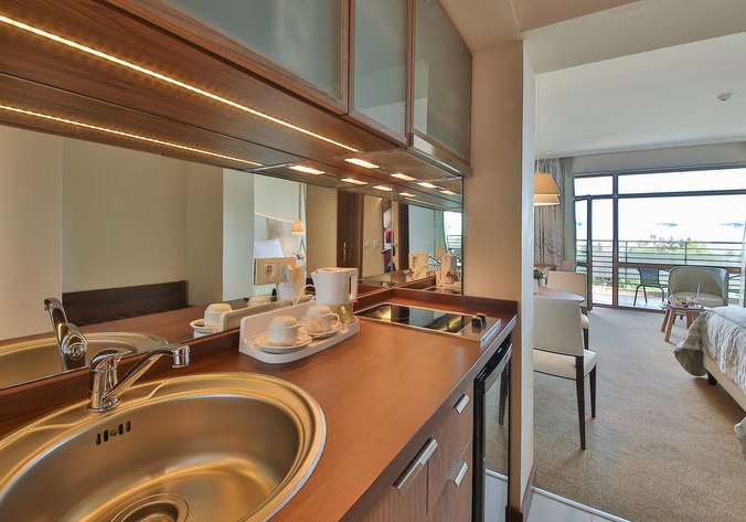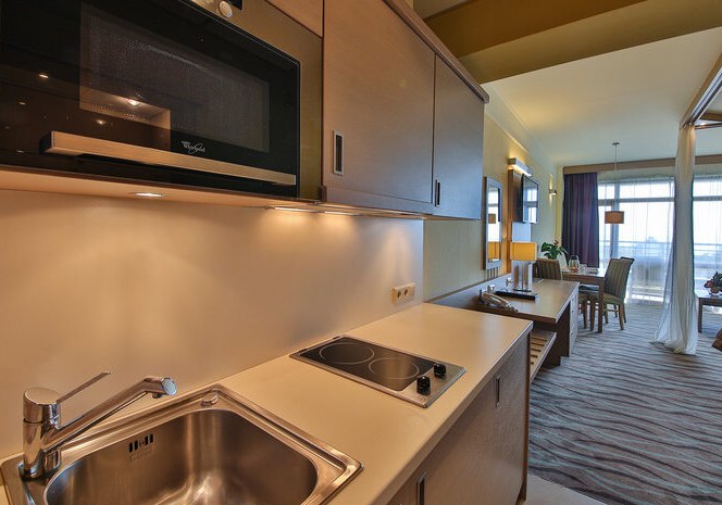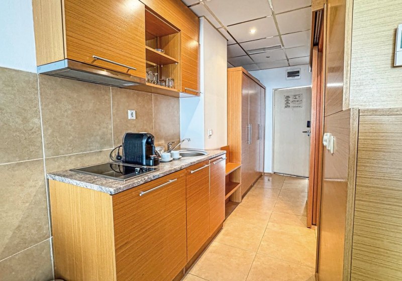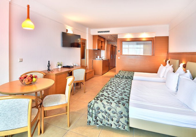 Studios und Suiten sind auf komfortable Abläufe ausgelegt: Klimaanlage, Balkon und eine Kitchenette mit Tee- und Kaffeezubereiter geben Euch Spielraum. LCD-TV, Pay-TV, Telefon und WLAN strukturieren Medien und Kommunikation. Safe und Minibar runden ab, Bademäntel liegen bereit. Highlight: Funktionale Kitchenette für selbstbestimmte Tagesrhythmen.