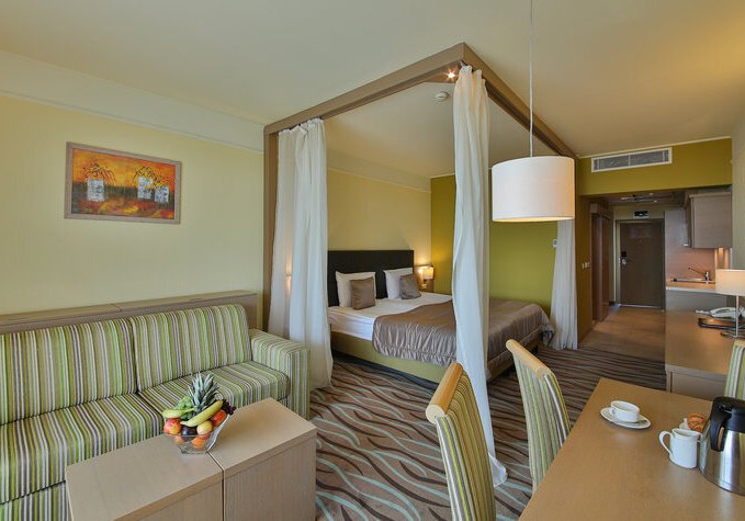 Flamingo Grand Hotel & Spa verbindet zentrale Lage in Albena mit nur 150 Metern bis zum Strand, klaren Zimmern mit Kitchenette und starker Gastronomie von Live-Kochen bis Weinbar. Das Spa "Elements" überzeugt mit Thermal- und Wasserzone, das Fitnessangebot und die Indoor-Golf-Akademie erweitern den Tag sinnvoll.