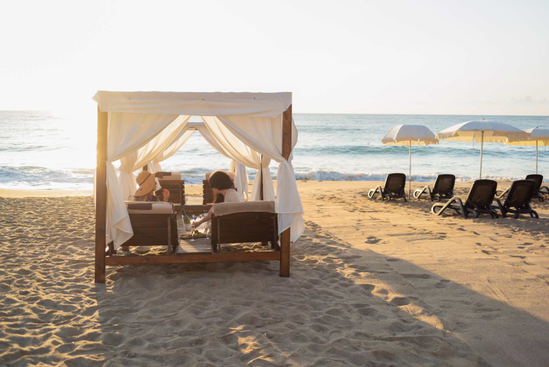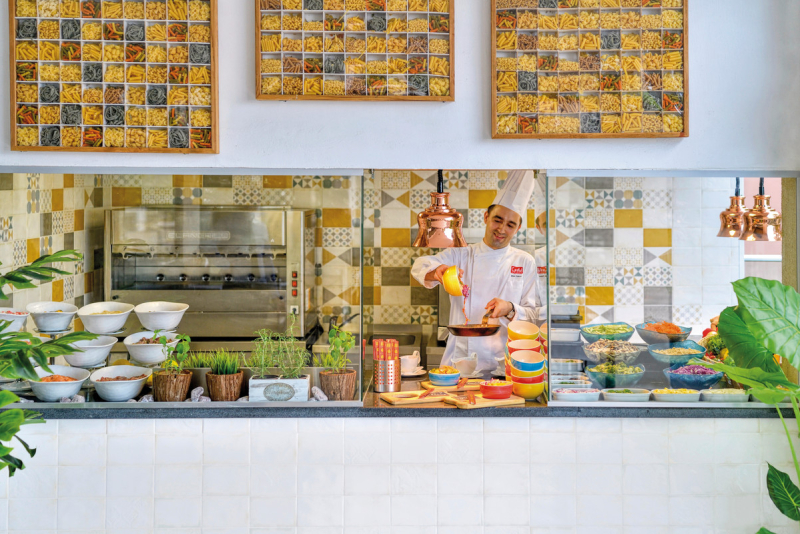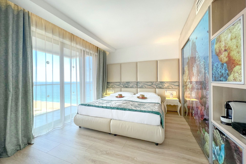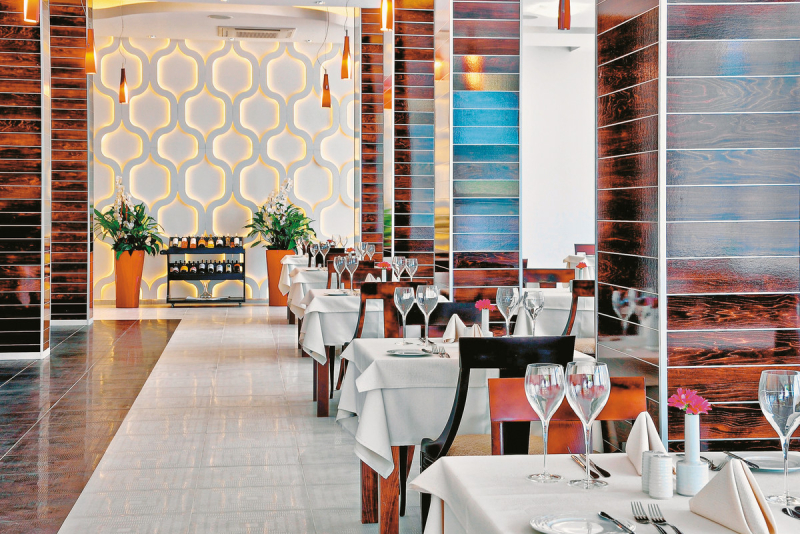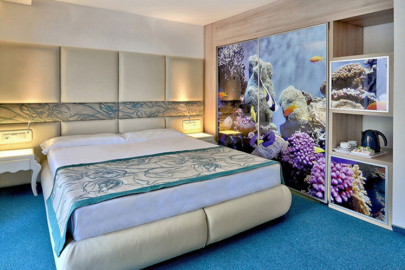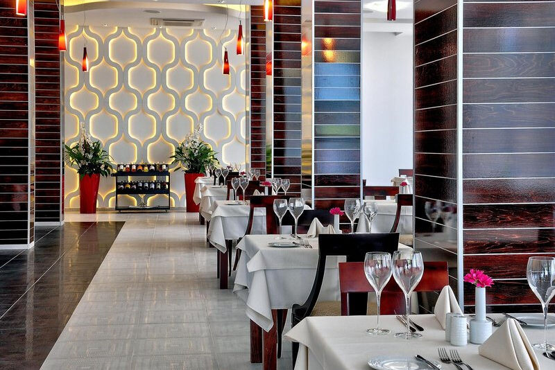 Die schlichten, eleganten und klimatisierten Zimmer sind mit Kingsize-Bett, Schreibtisch und Sitzecke ausgestattet. Zudem sind Telefon, TV, kostenloses W-LAN, Safe und Minibar vorhanden. Alle Räume verfügen über ein eigenes Bad mit Toilettenartikeln, Fön, Dusche und WC. Einige Zimmer bieten einen möblierten Balkon mit Pool- oder Meerblick. Besonders beeindruckend ist die kunstvolle Gestaltung der Zimmer durch helle Wandmalereien mit Unterwassermotiven. Es können Einzel-, Doppel- und Familienzimmer gebucht werden. Die Suiten stellen einen zusätzlichen Wohnbereich zur Verfügung.Gastronomie / Restaurants