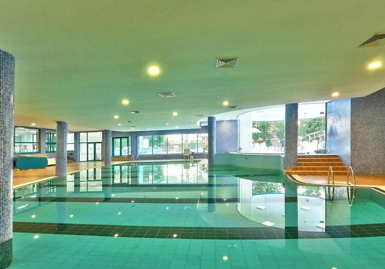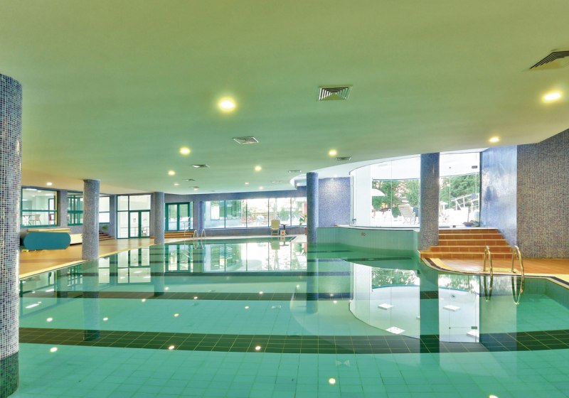 Die öffentlichen Bereiche sind übersichtlich organisiert: Lobby mit Rezeption, großzügige Terrassen, Süßwasser-Außenpool, Kinderbecken und ein Hallenbad. Am Pool warten Liegen und Sonnenschirme, Handtücher erleichtern den Tag. WLAN steht in der Lobby bereit, Parkplätze runden die praktische Seite ab.