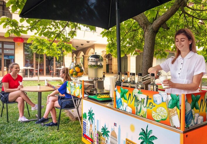 Ihr esst vielfältig und unkompliziert: Drei Buffetrestaurants – Nessebar, Estrellas Ibericas und La Spiaggia del Sole – decken den Tageslauf von Frühstück bis Abendessen ab. Ergänzend erlebt Ihr kulinarische Abwechslung im indischen Restaurant „Ravi“ und im chinesischen „Hot Pot“. Highlight: Breite Auswahl mit klaren Schwerpunkten – Buffet plus Spezialitäten.