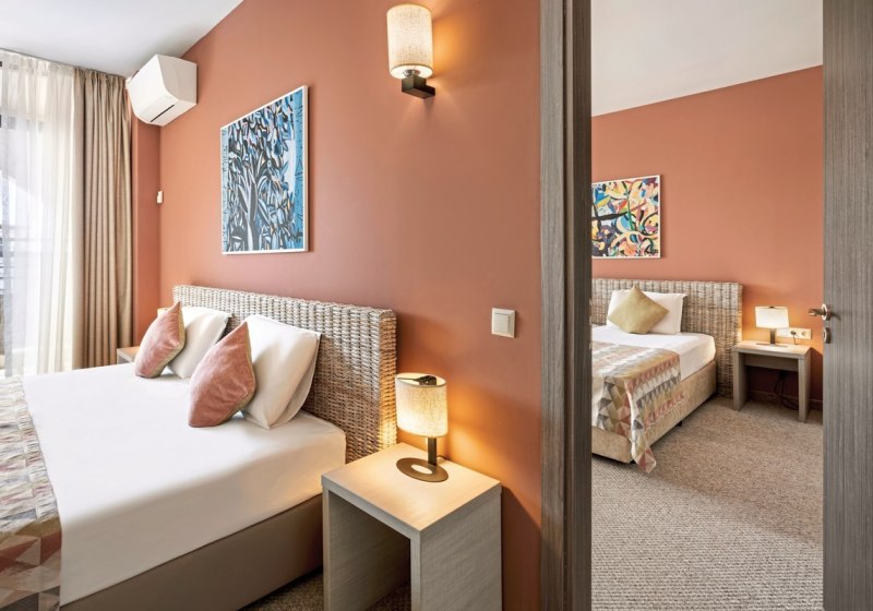Die Zimmerauswahl ist klar strukturiert: Doppelzimmer, Juniorsuiten und Familienzimmer. Alle mit Bad oder Dusche/WC, Föhn, Klimaanlage, Safe, Telefon, Sat-TV, Minikühlschrank und Balkon. Die Gestaltung setzt auf Funktion und Verlässlichkeit – Ihr richtet Euch ein und startet in kurze Wege zu Strand, Pool und Restaurants. Highlight: Balkon standardmäßig – Frischluft und Rückzug nach Wahl.
