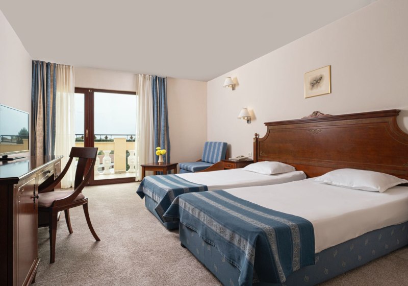 Die 238 Zimmer sind funktional ausgestattet: Bad/WC mit Föhn, Klimaanlage, Sat-TV, Schreibtisch und Mietsafe, dazu Minibar und Telefon. Die meisten Einheiten verfügen über möblierten Balkon oder Terrasse; je nach Kategorie ist Meerblick verfügbar. Teppich- oder Fliesenboden, zwei Einzelbetten und ein Schlafsessel schaffen Klarheit im Grundriss.