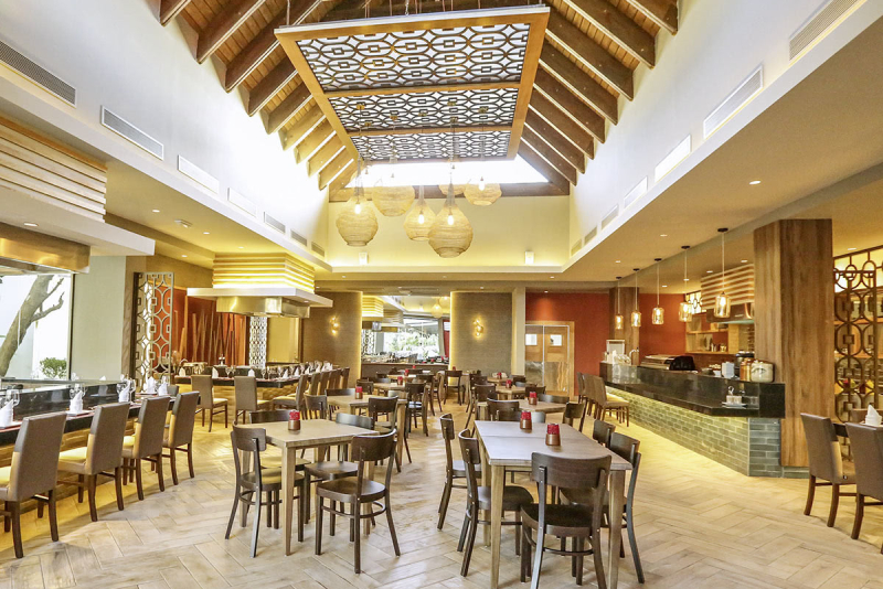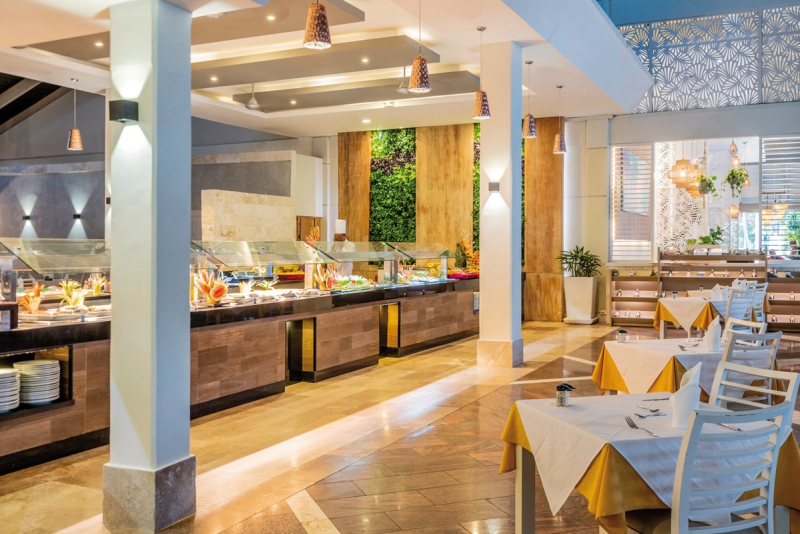 Das Hotel verfügt über insgesamt sechs verschiedene Restaurants, die eine Vielzahl von kulinarischen Optionen bieten, von internationaler Cuisine, über italienische und mexikanische Gerichte bis hin zu asiatischen Spezialitäten. Darüber hinaus gibt es sieben Bars, darunter drei Poolbars und eine Strandbar. Das All-inclusive-Angebot umfasst neben den Hauptmahlzeiten auch Snacks und sowohl alkoholische als auch nichtalkoholische Getränke.Ausstattung