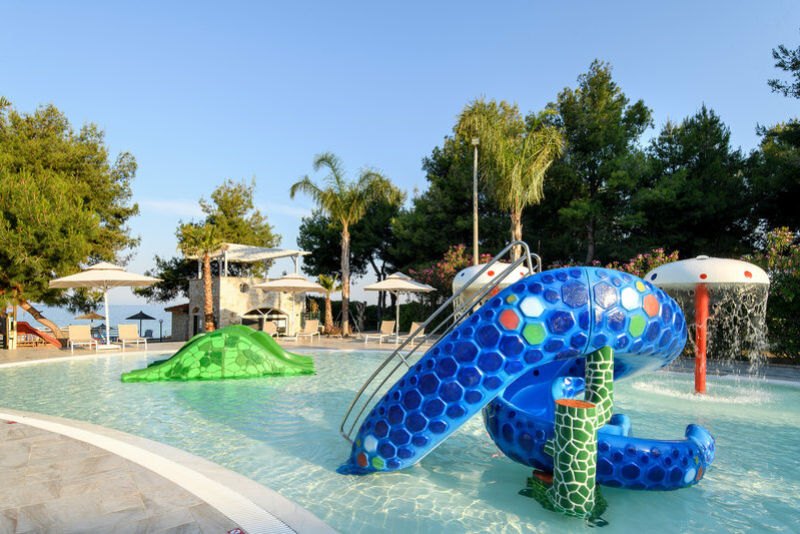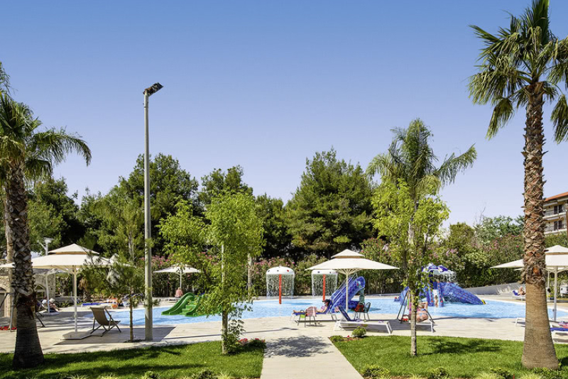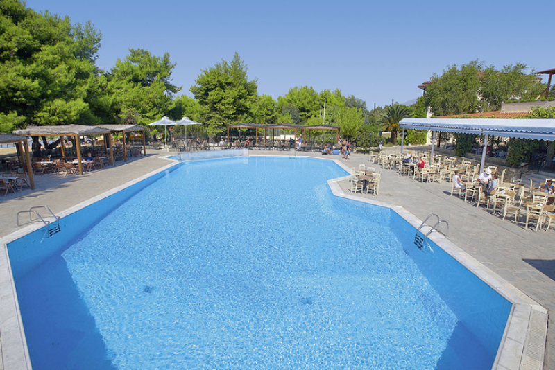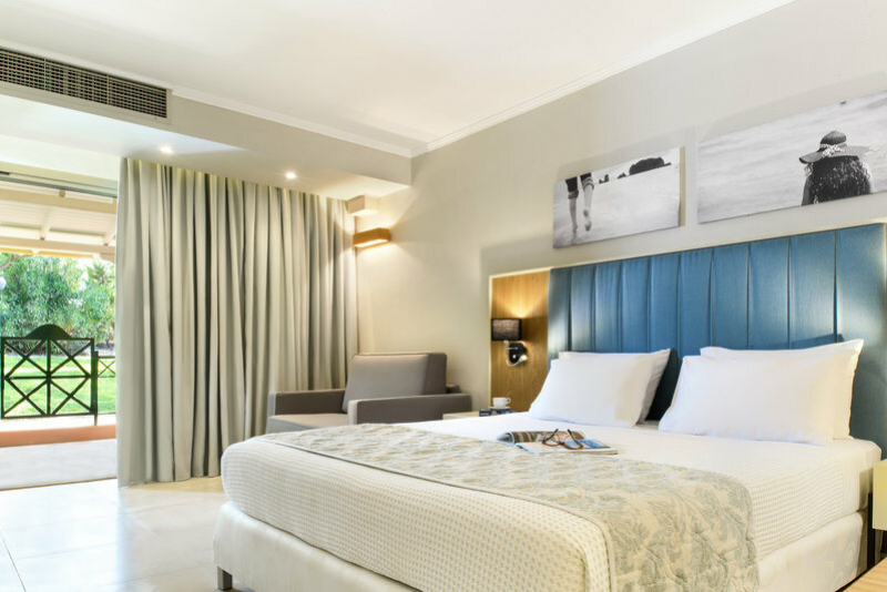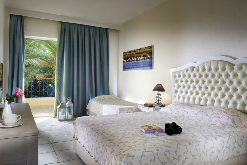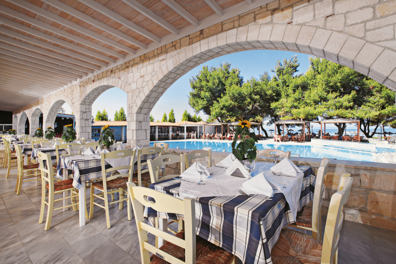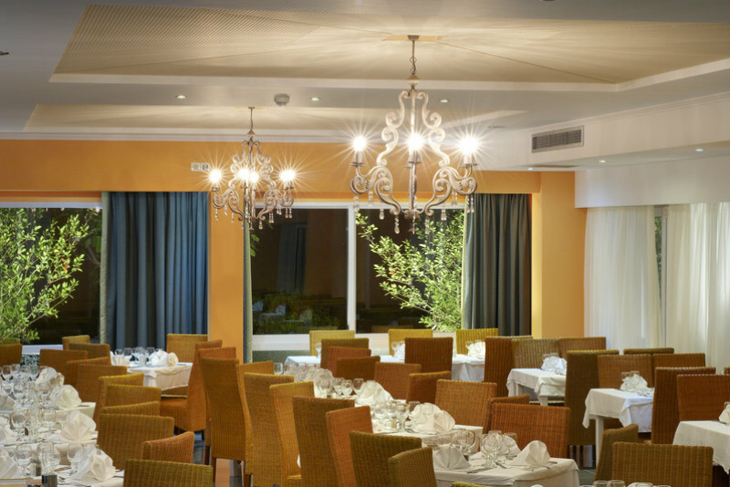 Das Hotel verfügt über zwei Restaurants, ein Buffetrestaurant und ein À-la-carte-Restaurant, die beide griechische und internationale Küche servieren. Es gibt auch zwei Bars, eine Hotelbar und eine Poolbar. Die Verpflegungsmöglichkeiten umfassen Halbpension und All-Inclusive-Angebote. Bei All-Inclusive sind Frühstück, Mittagessen, Abendessen, Snacks sowie ausgewählte lokale und internationale alkoholische und alkoholfreie Getränke enthalten.Ausstattung