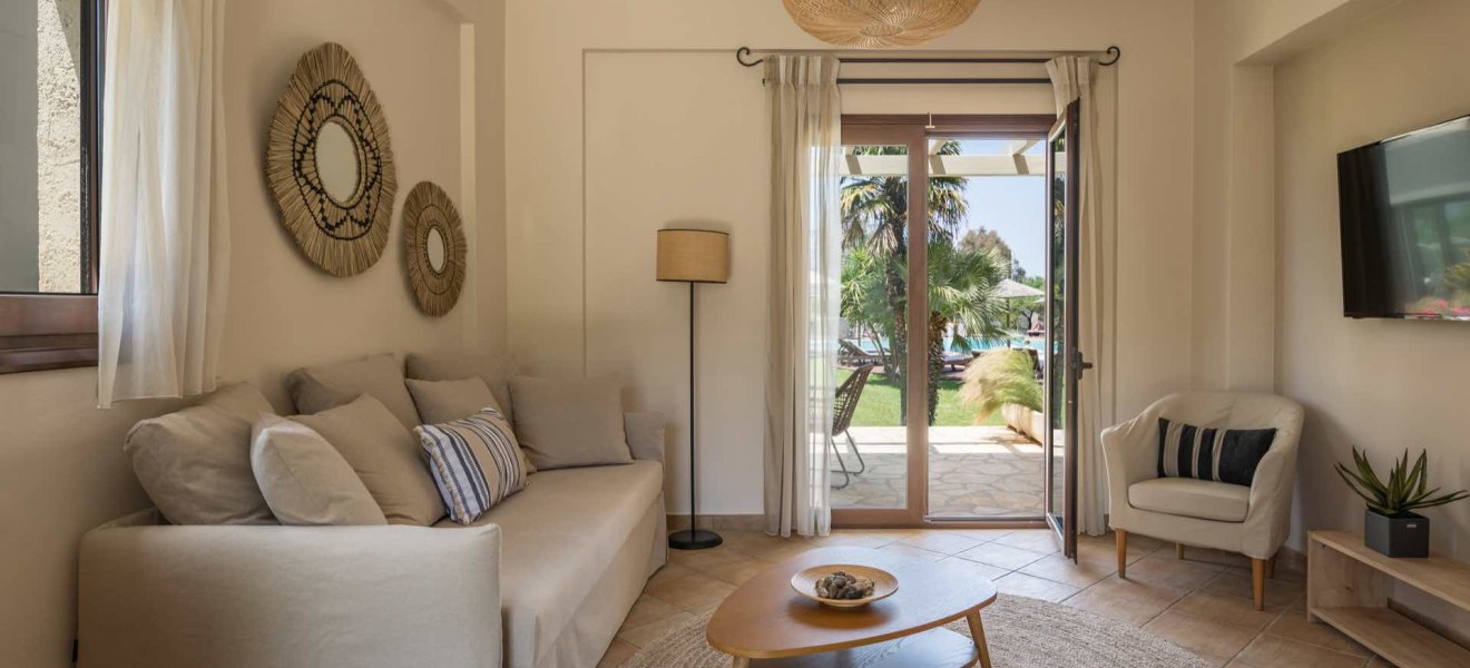 Almyros Villas Resort verbindet die Überschaubarkeit eines charmanten Resorts mit stimmigen Rückzugsorten für Paare und Familien. 26 Wohneinheiten verteilen sich auf sechs Gebäude, dazwischen ein großer Außenpool mit separatem Kinderbecken und eine Holzterrasse mit Liegen und Schirmen. Ihr lebt entspannt in Eurem Rhythmus, wechselt zwischen Wasser, Garten und kurzen Wegen zum Strand. Die Atmosphäre wirkt gelassen, ohne Trubel, mit viel Raum für ruhige Stunden.