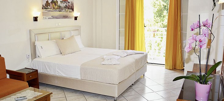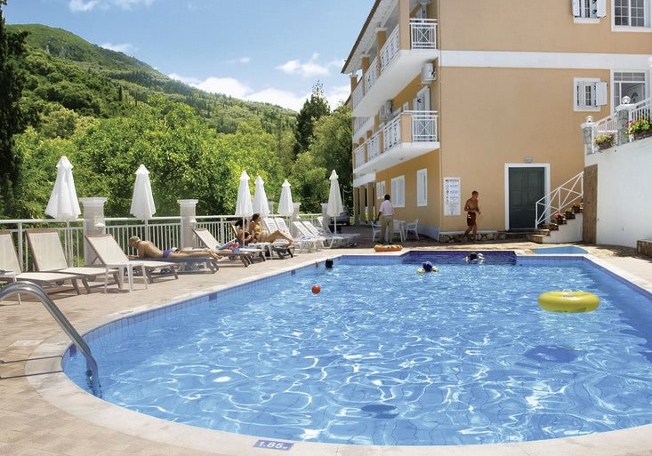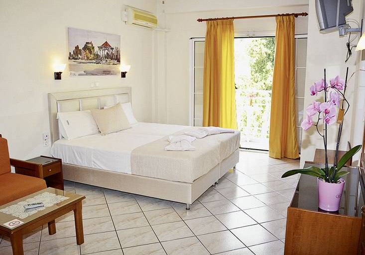 Im Aparthotel Angelica wohnt Ihr überschaubar und persönlich: 19 Wohneinheiten, offiziell mit 3 Sternen der Landeskategorie bewertet, eingerahmt von Garten, Außenterrasse und Pool. Die Atmosphäre ist ungezwungen, mit kurzen Wegen zwischen Rezeption, Sonnenterrasse und Poolbar. Dank Kitchenette in den Studios gestaltet Ihr Euren Tag flexibel – früh ein Bad im Pool, später Kaffee auf dem Balkon, abends entspannt zum Buffet. Die Wege ins Zentrum von Agios Gordios sind kurz, der Strand liegt in Reichweite.