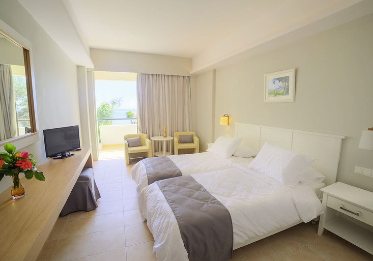 Die Zimmer sind funktional ausgestattet: Dusche, WC, Föhn, Telefon, Sat‑TV, Klimaanlage und WLAN gehören zur Grundausstattung. Ein Minikühlschrank hält Erfrischungen bereit, dazu kommen Mietsafe und Kaffee‑/Teezubereiter. Viele Einheiten verfügen über Balkon oder Terrasse; je nach Kategorie blickt Ihr in die Gärten oder aufs Meer.