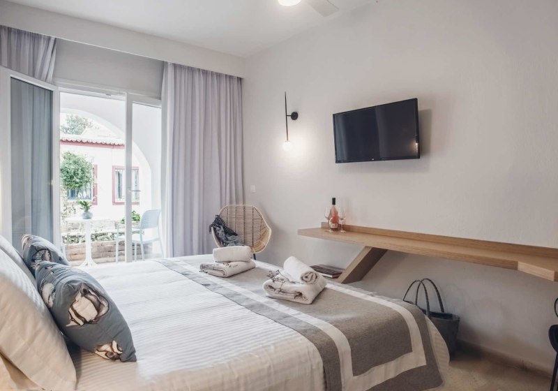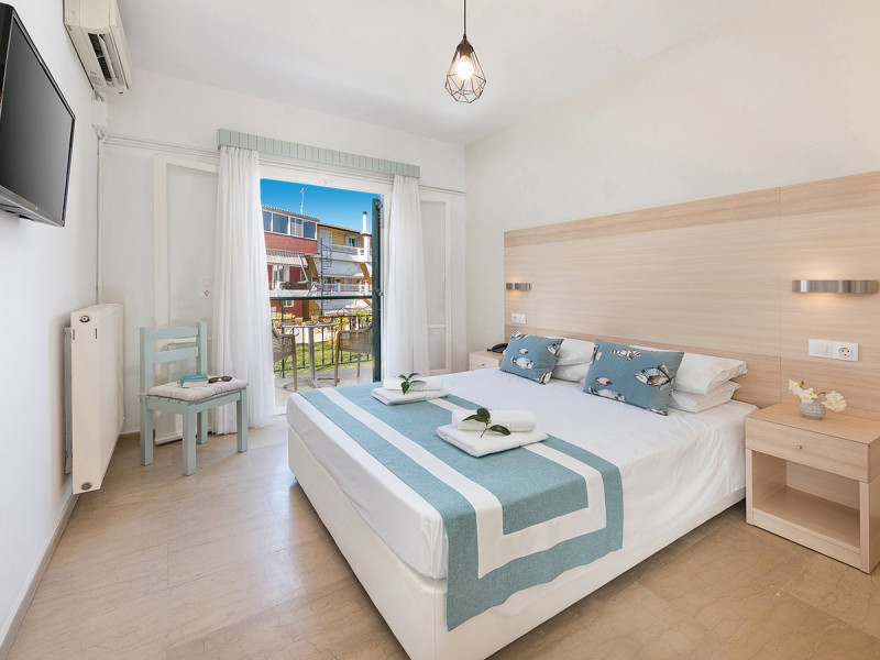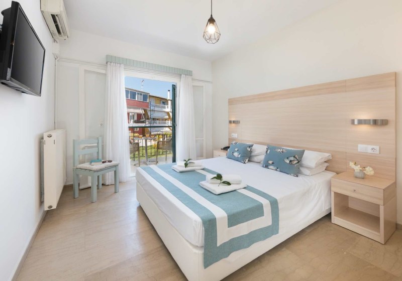 Im Iliada Beach wohnt Ihr direkt am Kiesstrand von Gouvia – mit der Bar auf der Strandseite nur wenige Schritte vom Wasser entfernt. Zwei Gebäude mit insgesamt 54 Nichtraucherzimmern bilden einen kompakten Rückzugsort für Erwachsene, denn das Mindestalter liegt bei 18 Jahren. Die Atmosphäre wirkt entspannt und schnörkellos, getragen von kurzen Wegen, klaren Strukturen und verlässlichem Komfort.