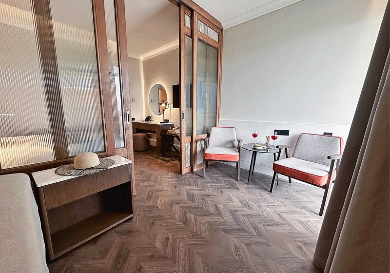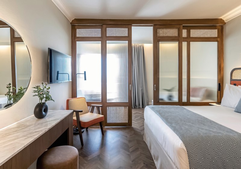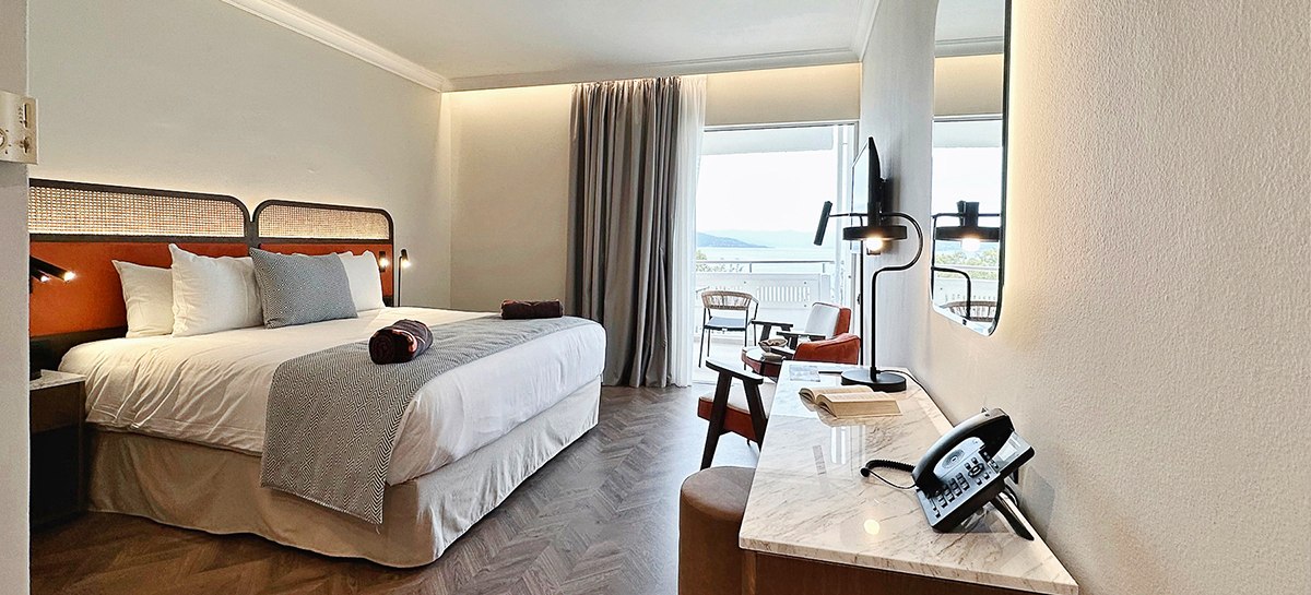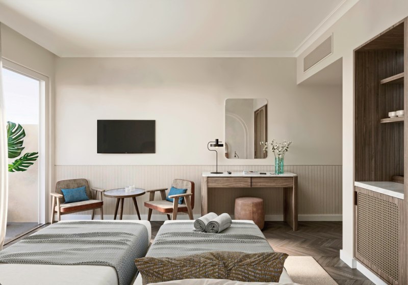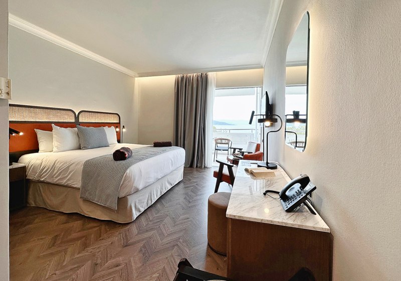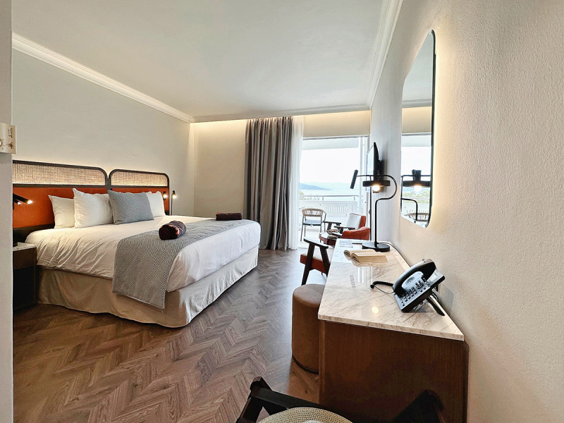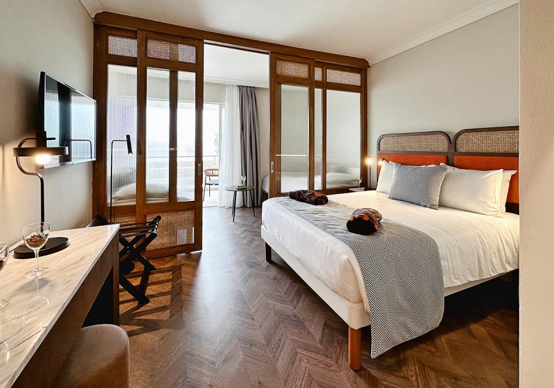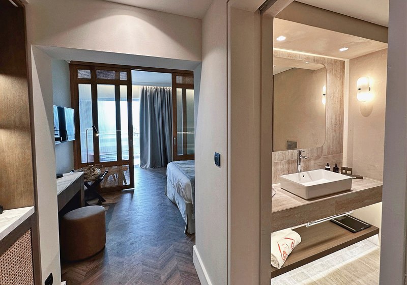 Die Zimmer sind funktional durchdacht und auf erholsame Nächte ausgerichtet. Walk-in-Dusche und WC, Föhn, Klimaanlage und Safe gehören ebenso zur Grundausstattung wie Flatscreen-TV und Minikühlschrank. Für den ersten Kaffee am Morgen steht eine Kaffee-/Tee-Station samt Espressomaschine bereit. Balkon oder Terrasse öffnen den Blick ins Grüne oder zum Meer.
