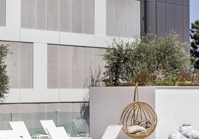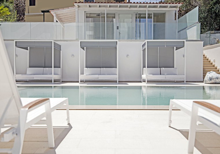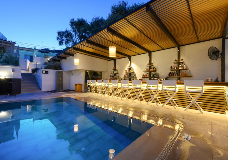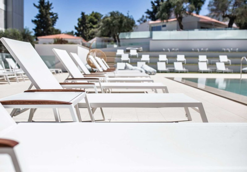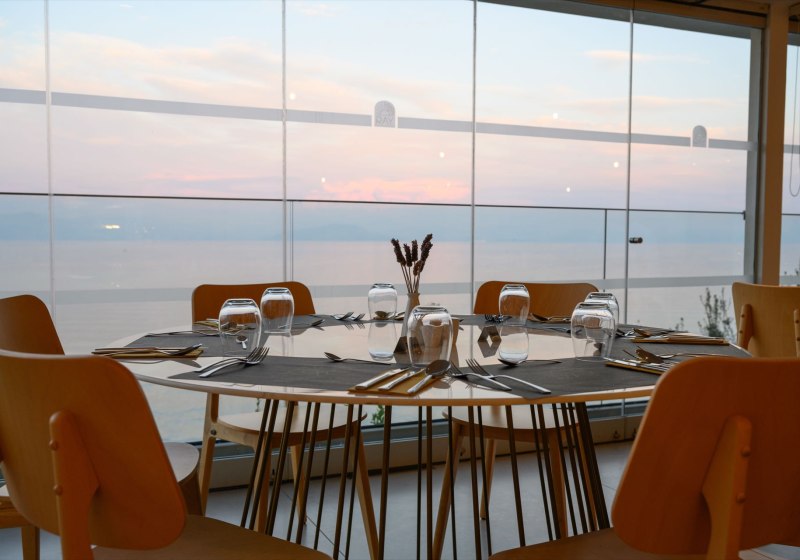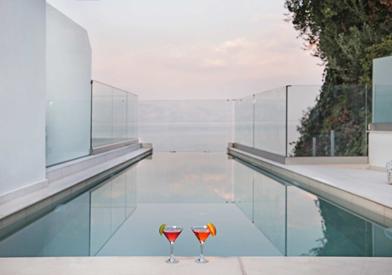 Der Hauptpool bietet Fläche zum Schwimmen, der Infinity-Pool setzt das Blau des Meeres fort. Das Bade- und Sonnendeck am Meer wirkt wie ein privater Steg für Eure Badezeit. Die kompakte Struktur ermöglicht kurze Wege zwischen Zimmern, Pools, Terrasse und Wasser.