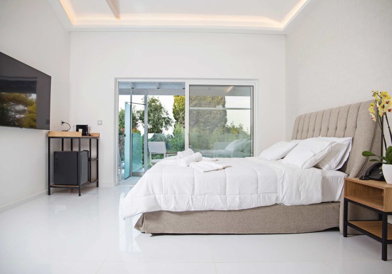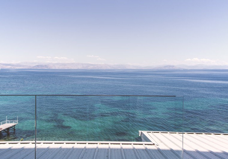 Ihr wohnt auf den Klippen der Bucht von Perama im Osten von Korfu. Der Zugang zum Meer erfolgt über eine Treppe hinunter zum Bade- und Sonnendeck. Diese erhöhte Lage verbindet weite Blicke mit direktem Wasserkontakt, ohne auf die Infrastruktur der Anlage zu verzichten.