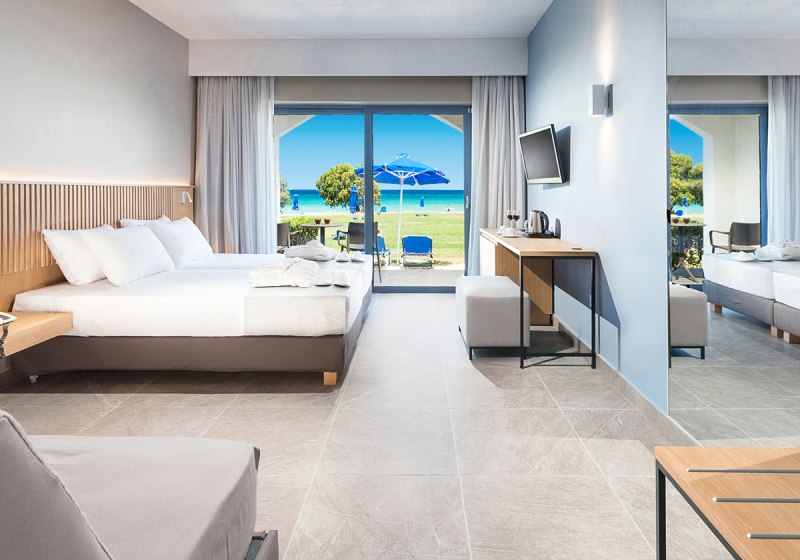 Ihr wählt zwischen Zimmern und Bungalows, teils mit Meerblick, alle mit Balkon oder Terrasse. Klimaanlage, Safe, Minikühlschrank, Kaffee-/Teezubereiter, Flat-Sat-TV und Telefon sind an Bord. Badezimmer mit Dusche/WC, Föhn und Pflegeprodukten; in bestimmten Kategorien Regendusche. Highlight: Juniorsuiten mit privatem Plungepool inklusive Whirlpoolfunktion.