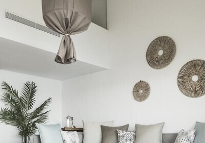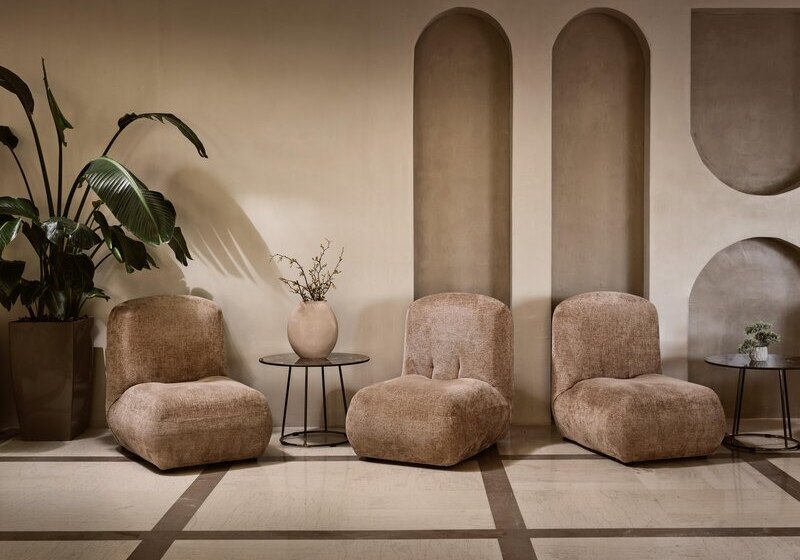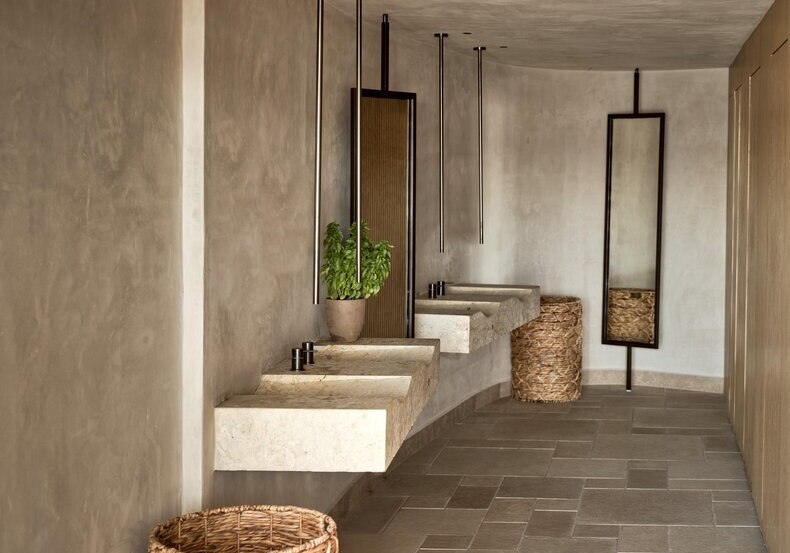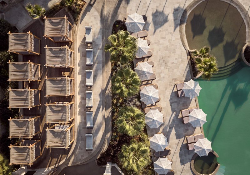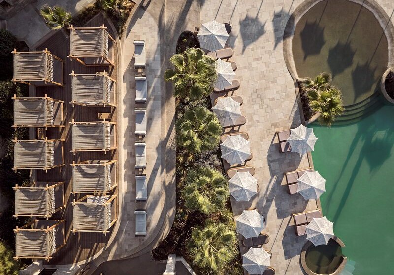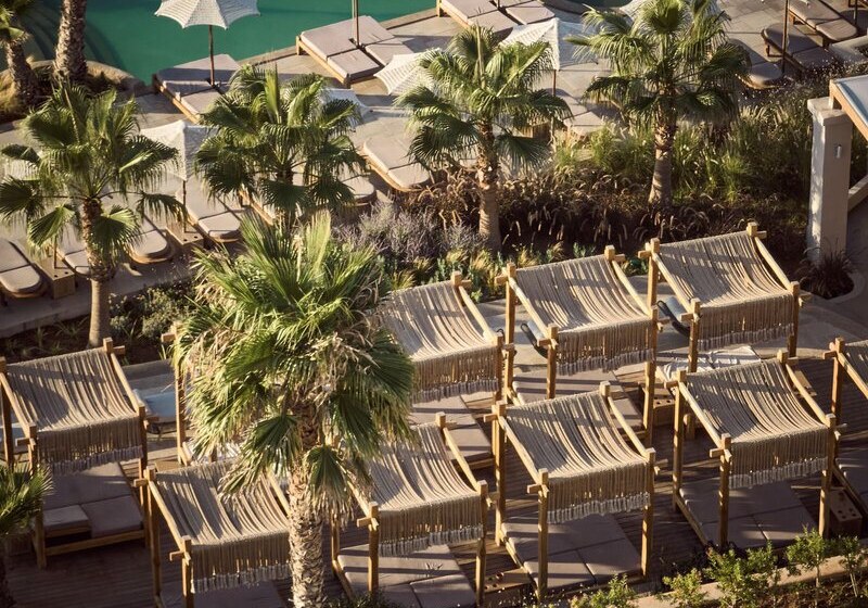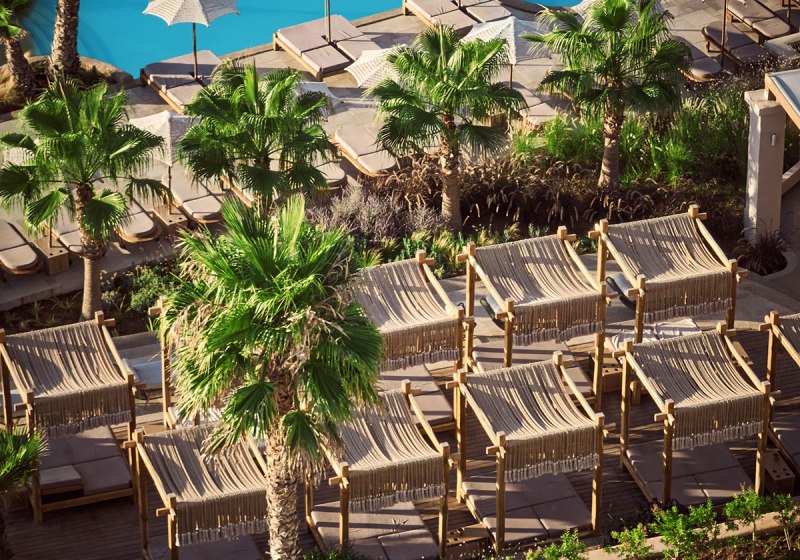 - Terrassenleben: Sonnenterrassen mit Liegen und Schirmen prägen das Draußen.