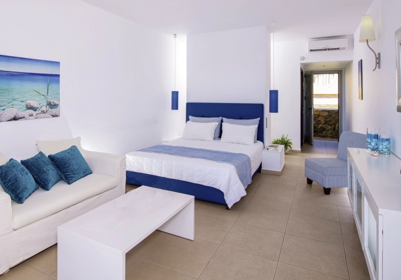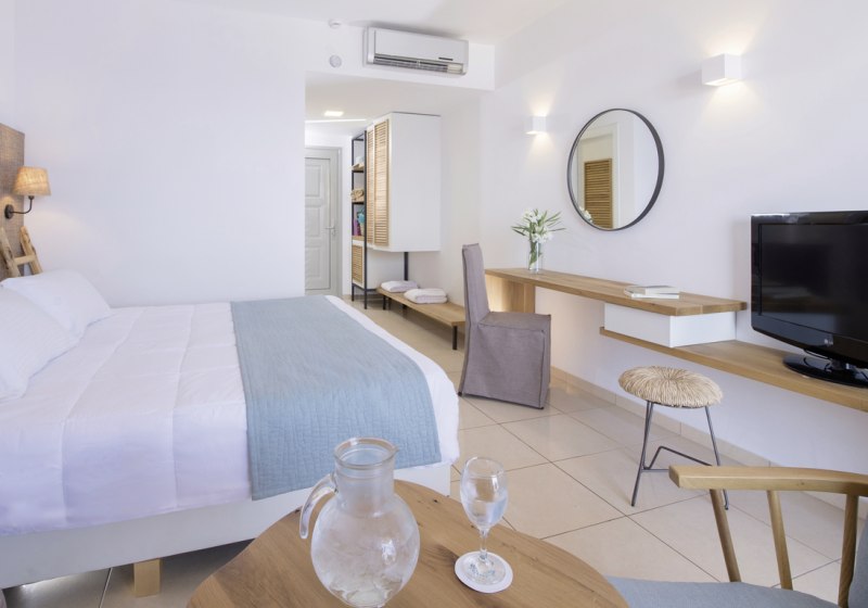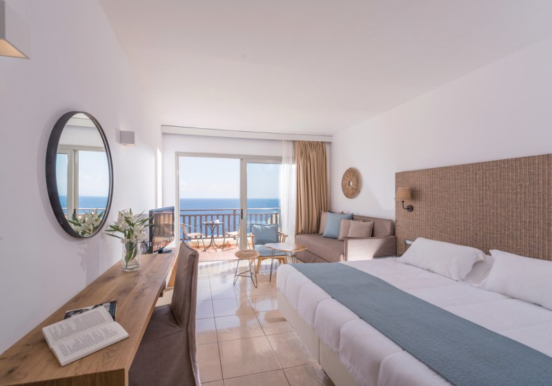 Die Zimmer sind funktional ausgestattet: Dusche/WC, zentral gesteuerte Klimaanlage, WLAN und Sat‑TV mit Film‑ und Sportkanälen. Safe, Minikühlschrank, Wasserkocher sowie Kaffee‑/Teezubereiter gehören ebenso dazu. Draußen erweitert ein Balkon oder eine Terrasse den Raum, teils mit Meerblick.