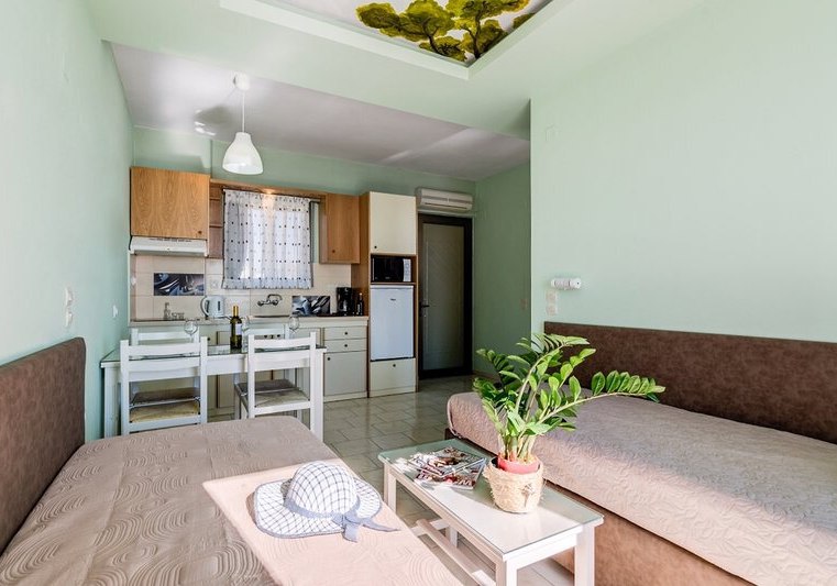Im Alkionis Beach Hotel wohnt Ihr in einer überschaubaren Anlage mit 21 Wohneinheiten, unmittelbar am Sandstrand von Sfakáki. Der Blick geht auf Meer und Strandabschnitt, der eigene Pool mit Hydromassagefunktion setzt den Ton für ruhige Tage zwischen Wasser und Sonne. Familien fühlen sich dank Spielplatz und den großzügig geschnittenen Wohneinheiten gut aufgehoben.