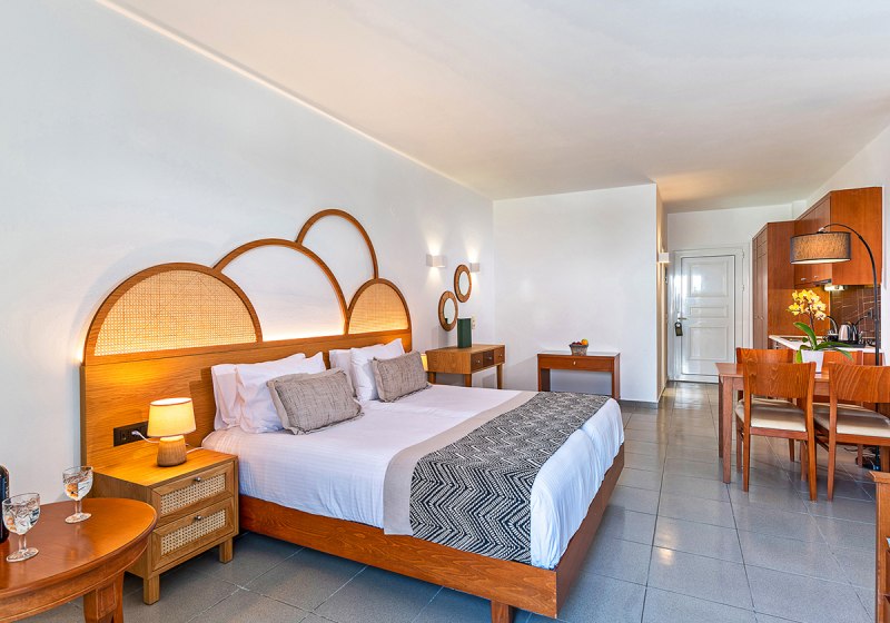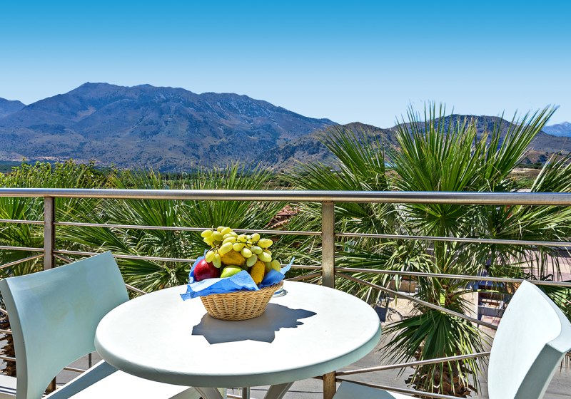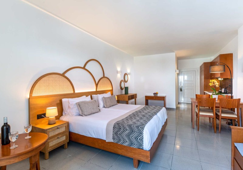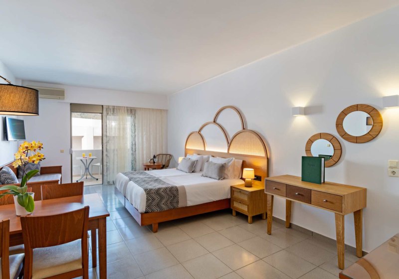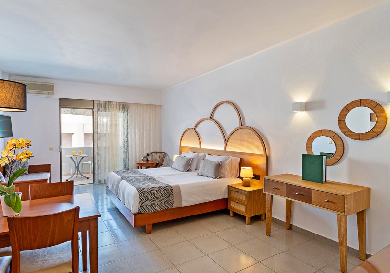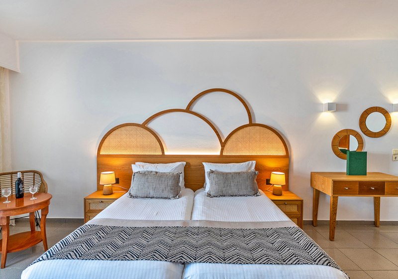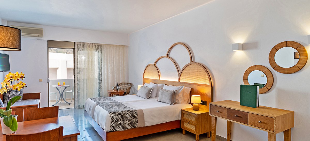 Ihr wählt zwischen Doppelzimmern, Einzelzimmern und Juniorsuiten. Charakteristisch sind Balkon oder Terrasse mit Blickrichtung Garten, Pool oder Berge. Zur Ausstattung zählen Klimaanlage, Sat-TV mit Musiksendern, WLAN, Telefon, kleiner Kühlschrank sowie Mietsafe. Das Bad verfügt je nach Zimmer über Wanne oder Dusche und ist mit Föhn ausgestattet.