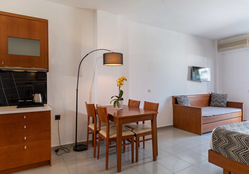 Auf große Animation oder Bühnenprogramm deutet nichts hin, die Abende wirken gelassen. Wer doch ein wenig Klang mag, nutzt die Musiksender am Sat-TV im Zimmer. So bleibt das Haus atmosphärisch zurückhaltend und bietet Euch Freiraum für Pläne außerhalb – von einem Spaziergang in Georgioupolis bis zum späten Strandgang in Kavros.